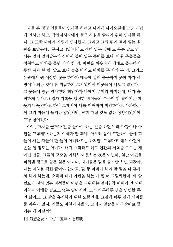 그 웃음에 방금 인사했던 책임자가 나에게 무어라 따지는데, 내가 솔직하게 무사고 0일차 기록을 갱신한 녀석들의 수준이 참 떨어지는 게 웃겨서 웃었다고 하니 그제서야 나를 이해하며 미안하다고 사과하는 게 그리 마음에 들지는 않았지만, 딱히 따질 것도 없는 상황이었기에 그냥 넘어갔다.