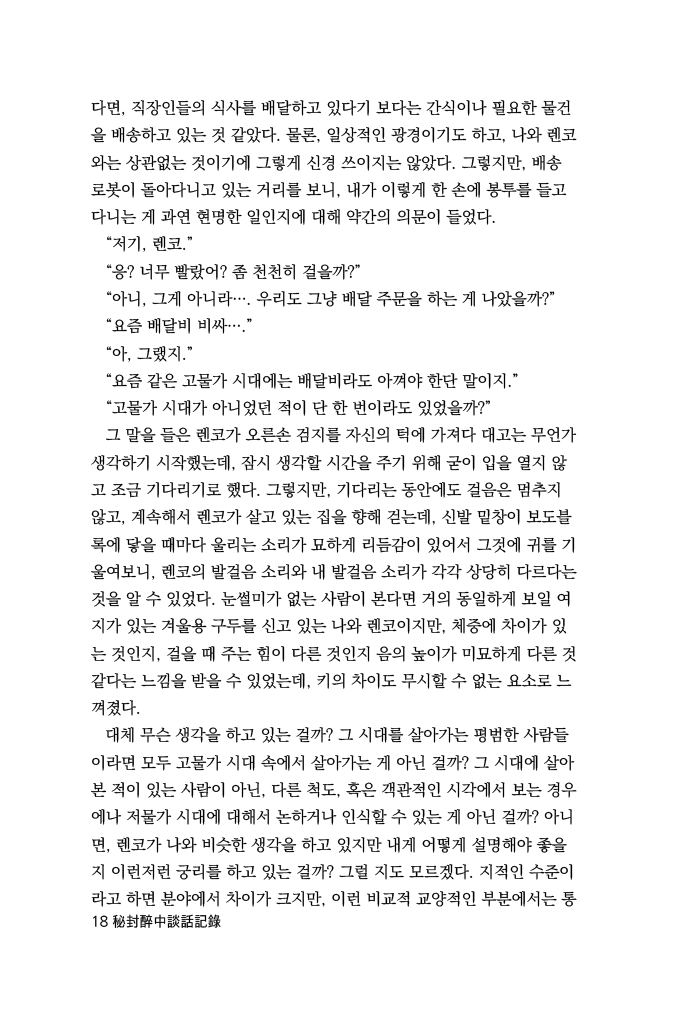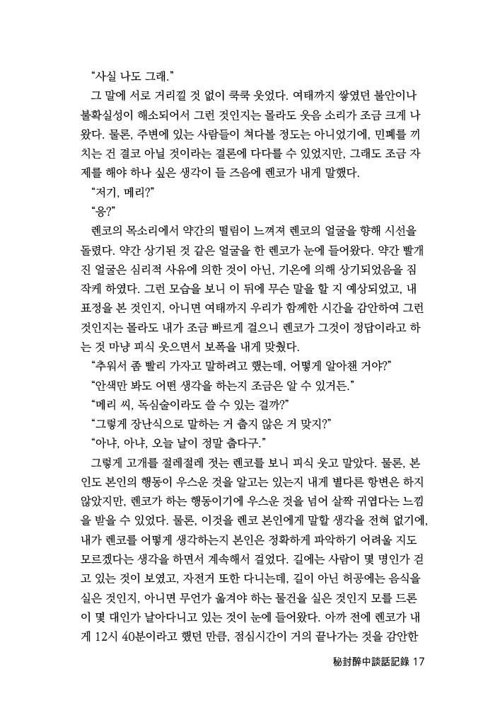 그런 모습을 보니 이 뒤에 무슨 말을 할 지 예상되었고, 내 표정을 본 것인지, 아니면 여태까지 우리가 함께한 시간을 감안하여 그런 것인지는 몰라도 내가 조금 빠르게 걸으니 렌코가 그것이 정답이라고 하는 것 마냥 피식 웃으면서 보폭을 내게 맞췄다.