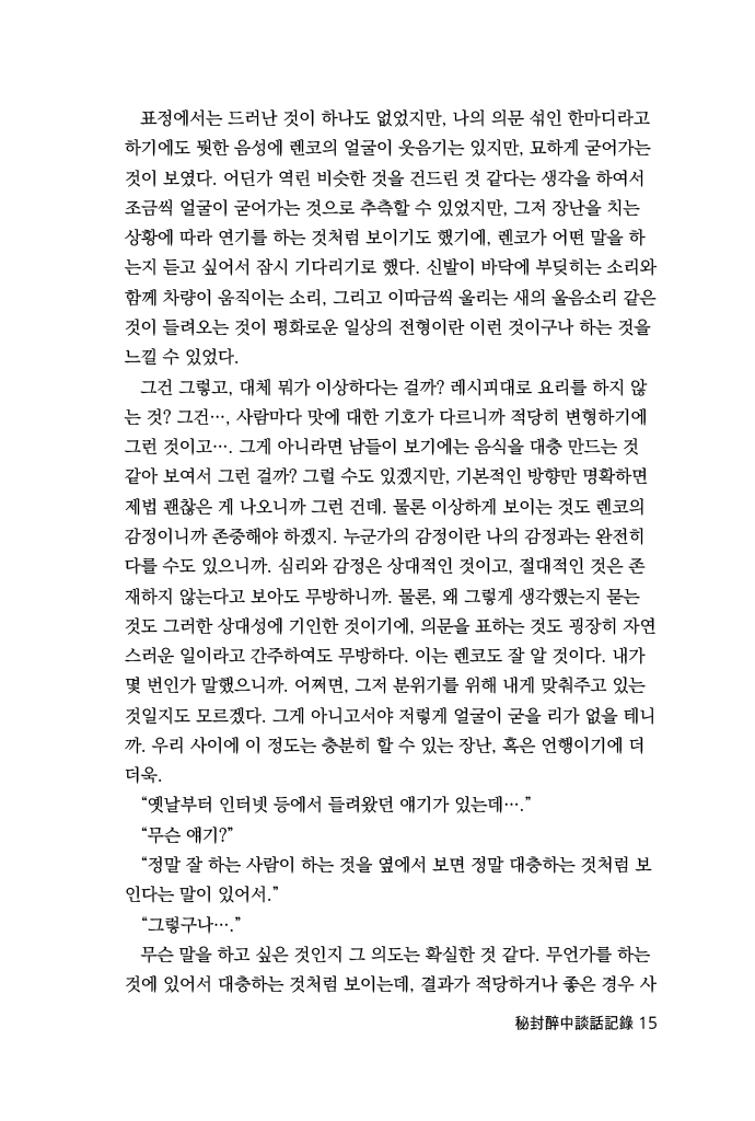 어찌되었건 큰 문제가 아니고, 사소한 문제라고 하기에도 너무나 작은 사건이었기에 렌코를 책망할 생각도 들지 않았는데, 그건 어쩌면 렌코의 농담이나 장난에 어울리고 싶다는 마음이 있어서 그런 것일 지도 모르겠다.