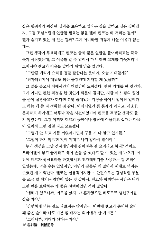 물론, 주변에 있는 사람들이 쳐다볼 정도는 아니었기에, 민폐를 끼치는 건 결코 아닐 것이라는 결론에 다다를 수 있었지만, 그래도 조금 자제를 해야 하나 싶은 생각이 들 즈음에 렌코가 내게 말했다.